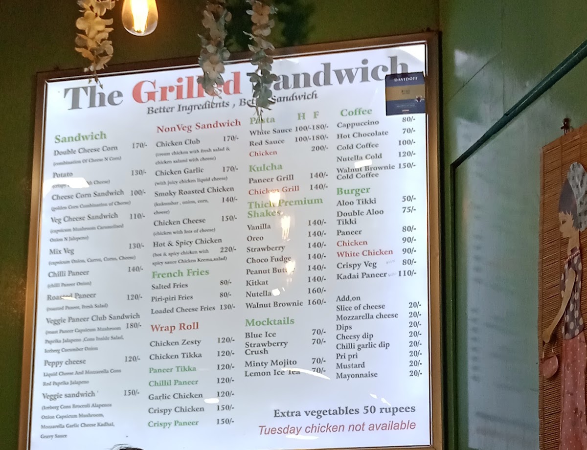 Located on Geeta Colony Road, this cafe offers a variety of grilled sandwiches alongside other food and beverages suitable for casual dining and light meals. The menu is structured to provide options for different tastes, including both vegetarian and non-vegetarian items.