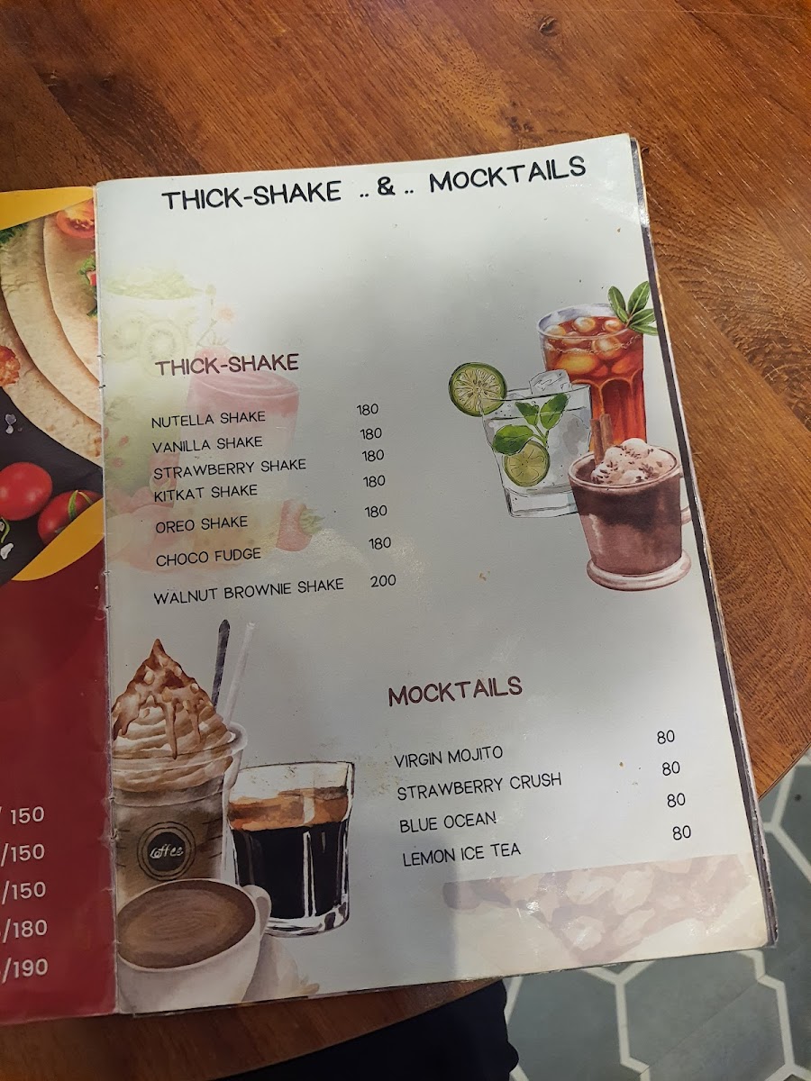 For beverages, the menu includes thick shakes with flavors such as Nutella, Vanilla, Strawberry, Kitkat, Oreo, Choco Fudge, and Walnut Brownie. There is also a selection of mocktails featuring Virgin Mojito, Strawberry Crush, Blue Ocean, and Lemon Ice Tea.